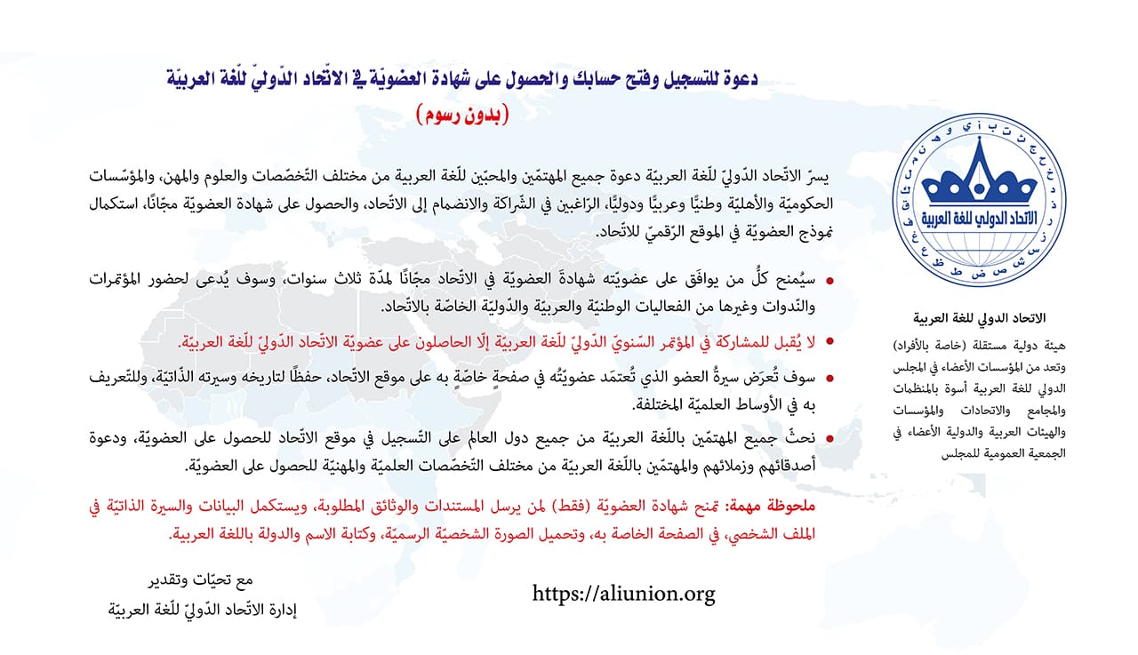 موقع الاتحاد الدولي للغة العربية موقع المؤتمر الدولي للغة العربية تحميل البيان الختامي والتوصيات (PDF) اللغة العربيّة وسوق العمل دورة "الأخطاء الشّائعة في كتابة الأبحاث العلميّة"· مشروع التنال العربي (العربيّة في لغة الإعلام المقروء والمسموع والمرئيّ). (اللغة العربيّة على مواقع التّواصل الاجتماعيّ)· اللغة العربية في كندا قناة اليوتيوب تحميل الدعوة PDF اللغة العربية في اليابان: الواقع والمأمول المطوية التعريفية الندوة الدولية للناطقين بغيرها - تجارب وخبرات دولية